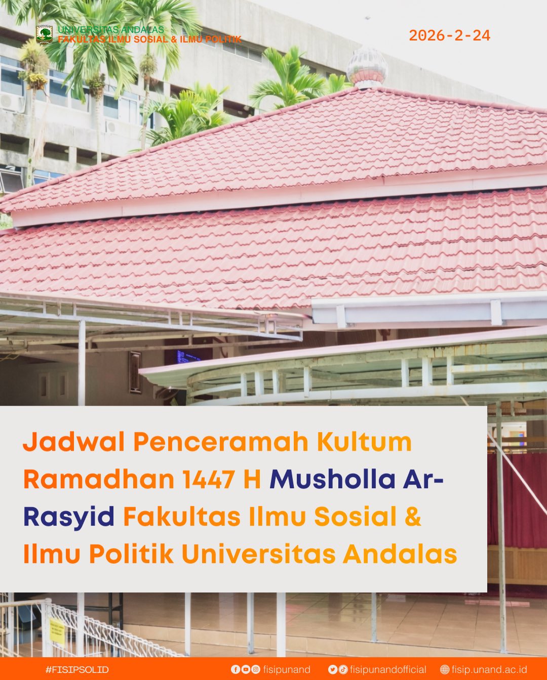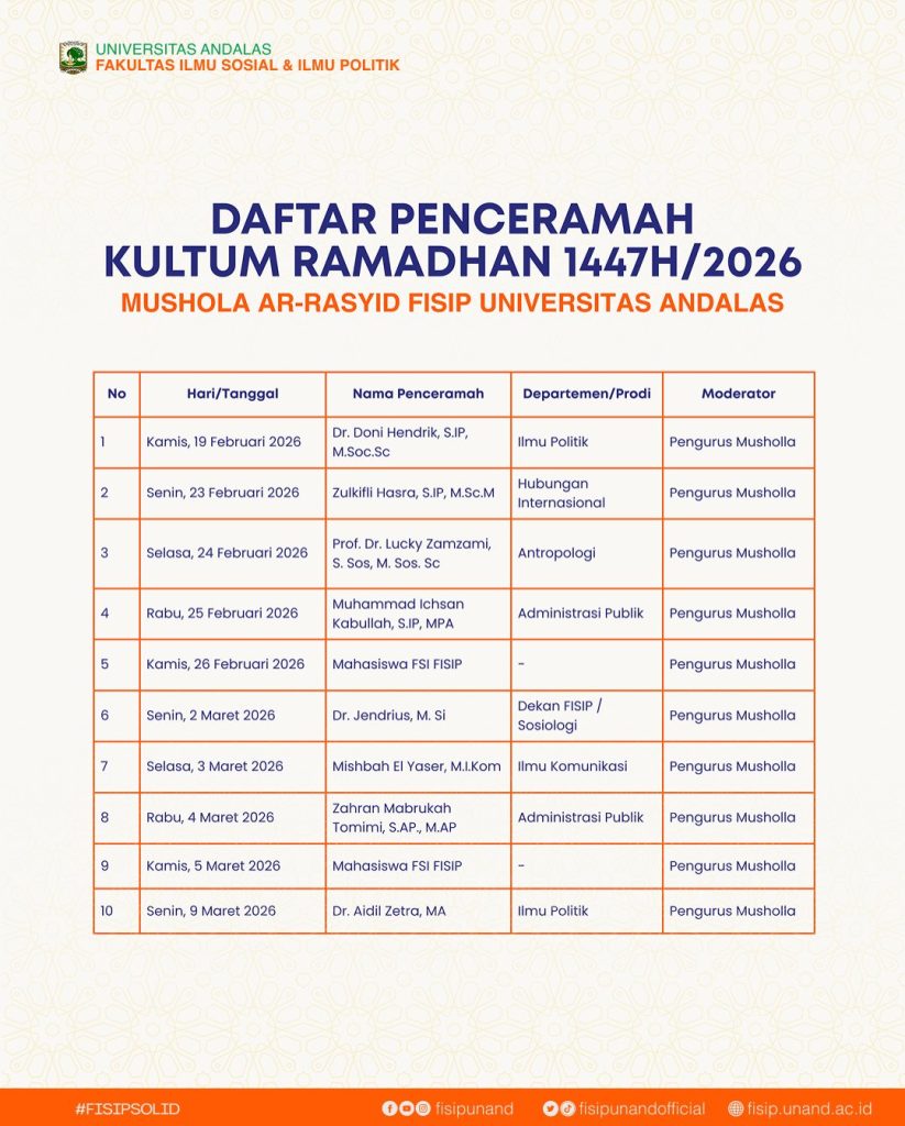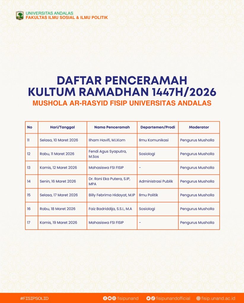 Padang, 24 Februari 2026 — Dalam rangka menyemarakkan bulan suci Ramadhan 1447 H, Fakultas Ilmu Sosial dan Ilmu Politik (FISIP) Universitas Andalas kembali menyelenggarakan kegiatan keagamaan berupa (kultum) yang dilaksanakan di Musholla Ar-Rasyid FISIP Universitas Andalas.