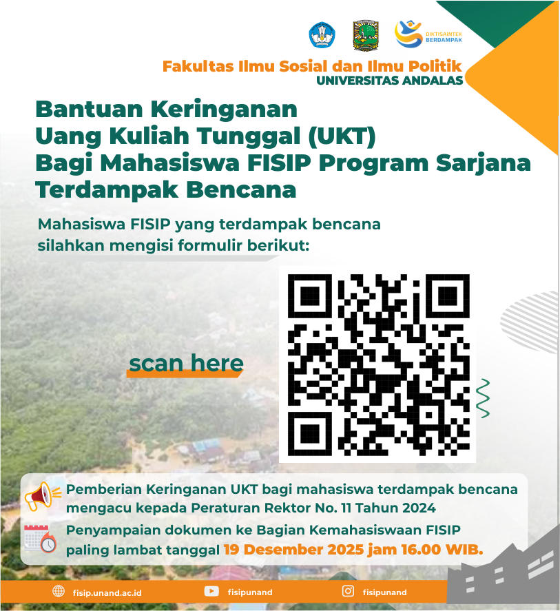 Menindak lanjuti Surat Rektor No B/2126/UN16.R/KM.05/2025, maka disampaikan sebagai berikut persyaratan dan administrasi yang harus dilengkapi oleh mahasiswa yang akan mengajukan permohonan keringanan UKT bagi mahasiswa yang terdampak bencana