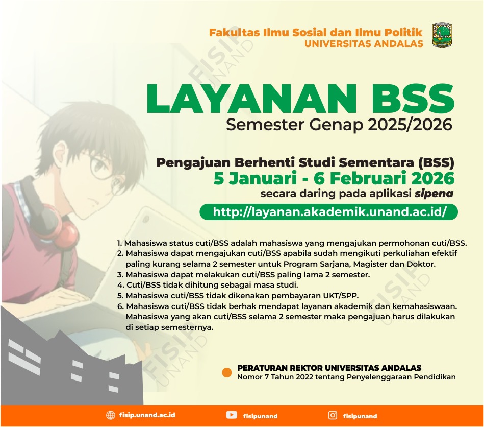 Fakultas Ilmu Sosial dan Ilmu Politik Universitas Andalas memberikan informasi terkait layanan akademik untuk mahasiswa pada Semester Genap Tahun Akademik 2025/2026:
